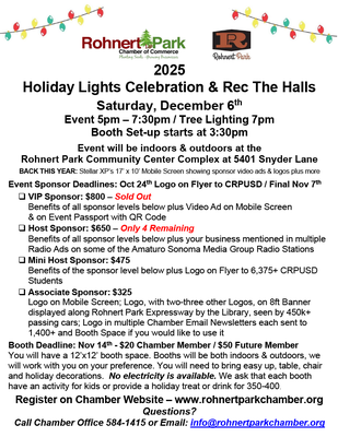 Market your business at this Rohnert Park Family Tradition - 2025 Holiday Lights Celebration & Rec The Halls where 1,500+ will attend! In case of rain, this event will be held inside the Community Center and the Callinan Sports Center.