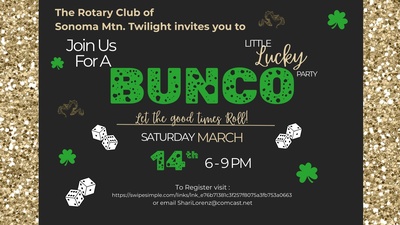 The Rotary Club of Sonoma Mountain Twilight is hosting a St. Patrick’s Day Bunco Fundraiser on Saturday, March 14, from 6:00–9:00 PM at the Cotati Room in Cotati City Hall.